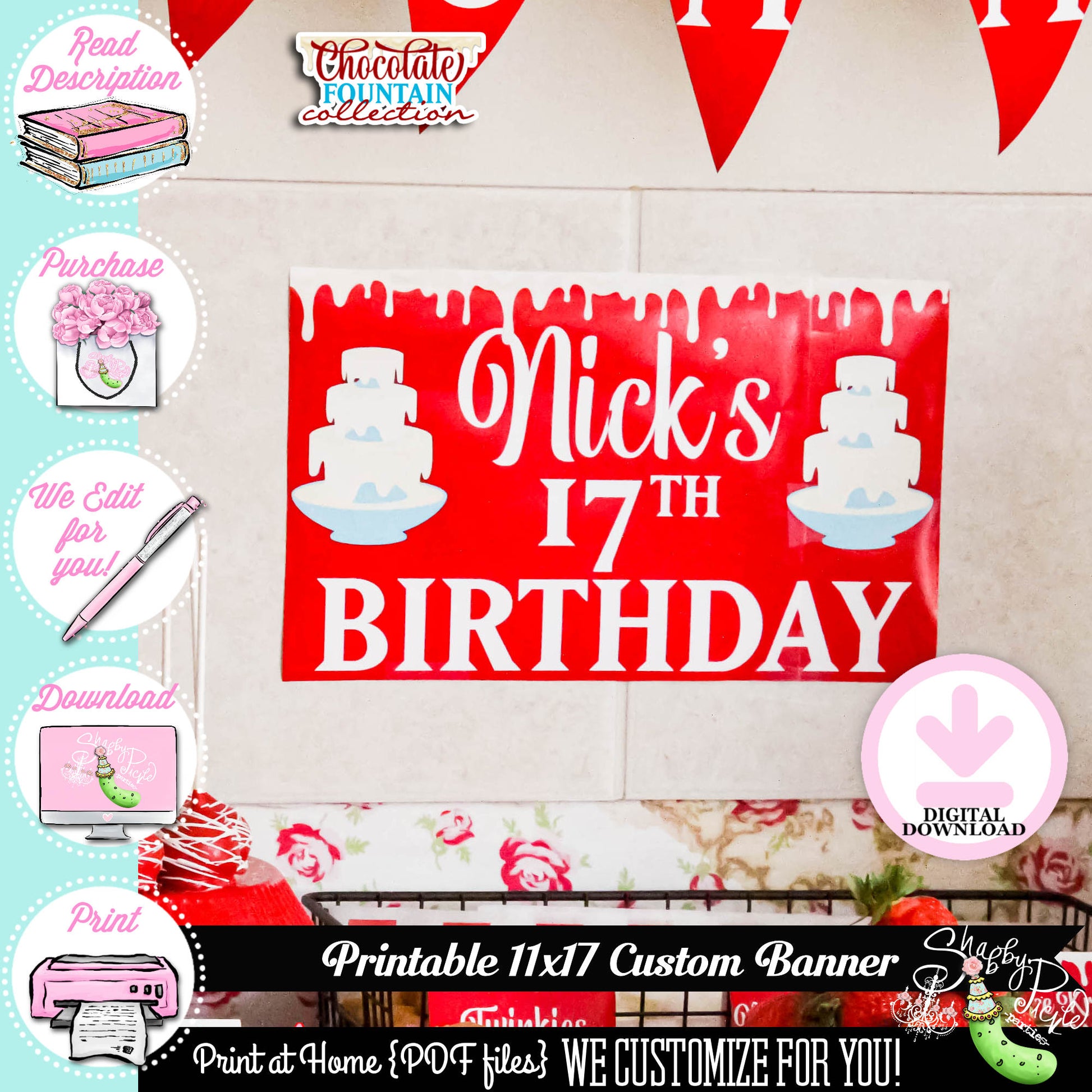 Chocolate Fountian Birthday-Banner Sign-We Customize-Personalized Name and Age-Custom Party-Dessert Table-Printable-DIGITAL DOWNLOAD