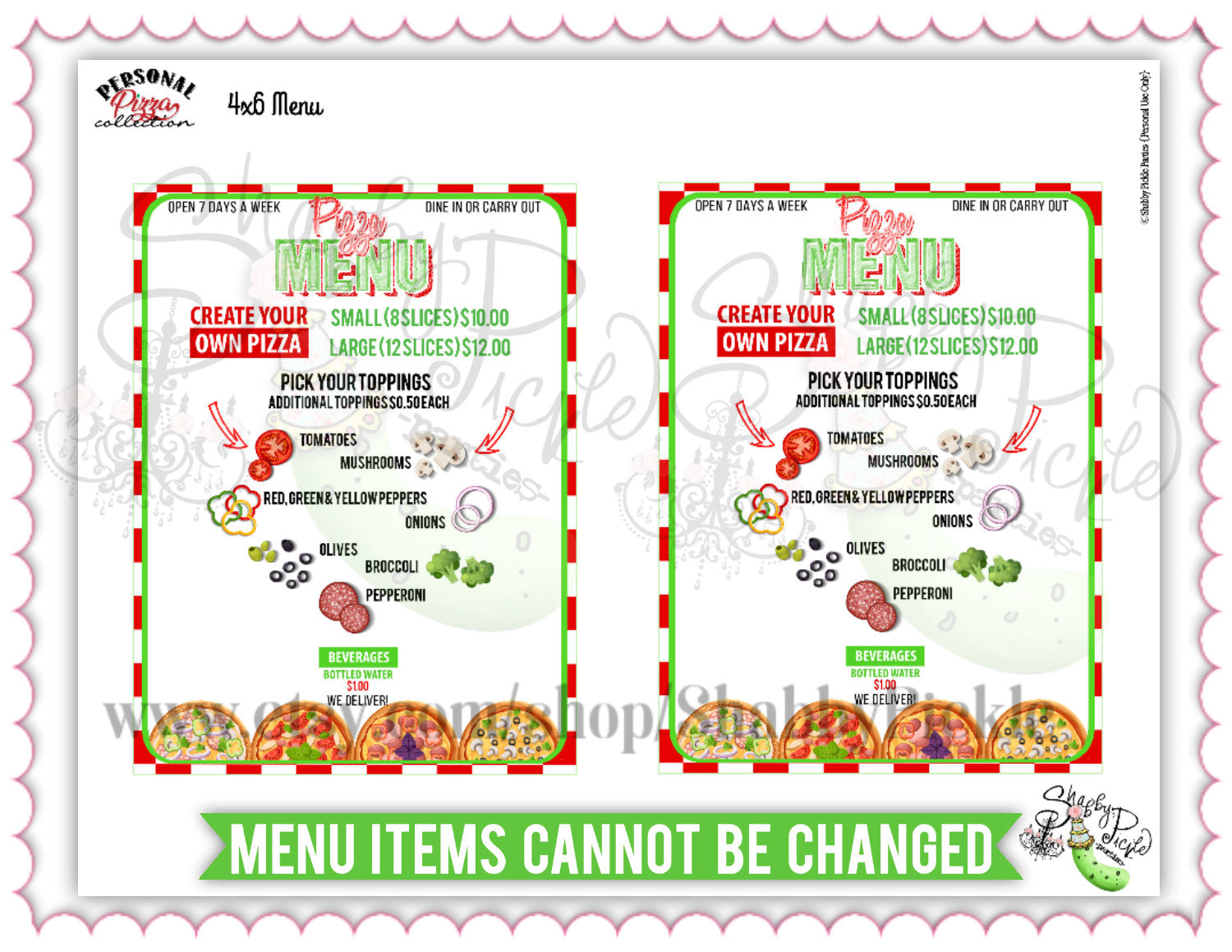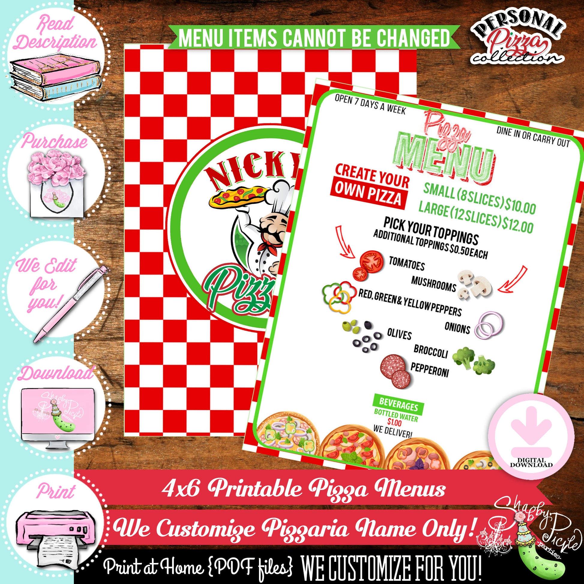 Personal Pizza-Menu-We Customize Pizzeria Name (Only)-4x6 Menu Font and Back-Playset-Pizza Party-Kids Pizza Shop-Printable-DIGITAL DOWNLOAD